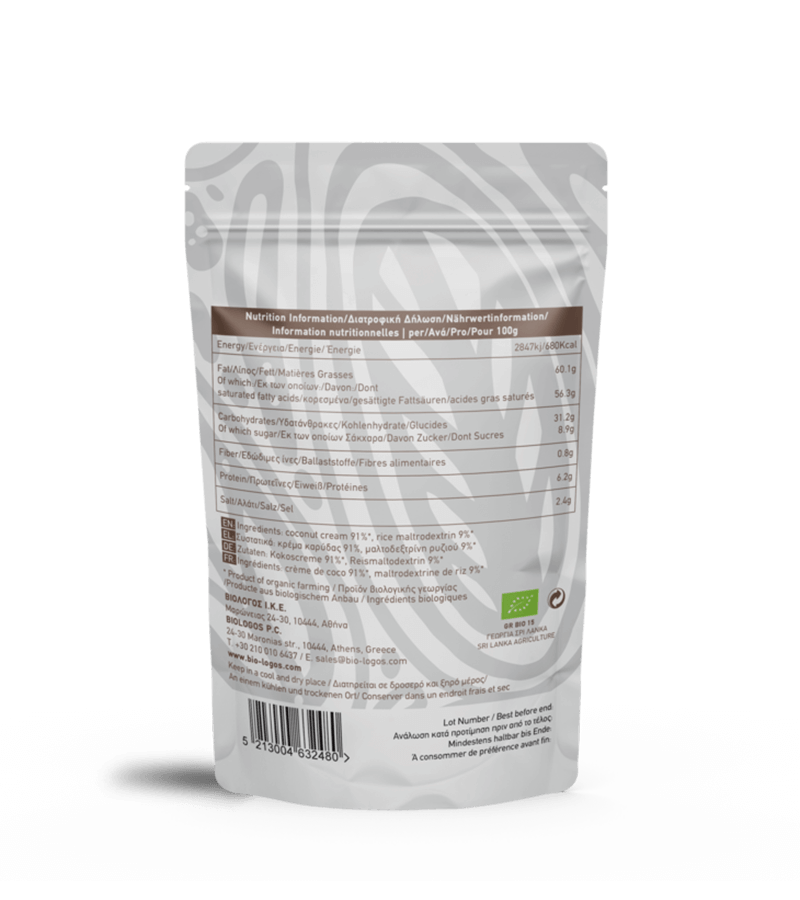 Το Βιολογικό Γάλα Καρύδας σε Σκόνη «Βιολόγος» είναι μια εξαιρετική επιλογή για όσους επιθυμούν να απολαύσουν την αυθεντική, πλούσια γεύση της καρύδας, συνδυάζοντας τα πολύτιμα θρεπτικά συστατικά που τη συνοδεύουν. Η φυσική του σύνθεση, χωρίς προσθήκη γλυκαντικών ή συντηρητικών, διατηρεί την καθαρότητα και την αγνότητα της πρώτης ύλης, παρέχοντας υγιεινά λιπαρά και μέταλλα, όπως το μαγνήσιο και το κάλιο, που συμβάλλουν στην καλή λειτουργία της καρδιάς και την αύξηση της ενέργειας. Η ελαφριά και κρεμώδης υφή του το καθιστά ιδανικό για καθημερινή χρήση σε smoothies, ροφήματα, γλυκά και μαγειρικά πιάτα, προσδίδοντας μοναδική γεύση και φυσική γλυκύτητα. Συνιστά μια άριστη επιλογή για όσους αναζητούν έναν εναλλακτικό, φυτικό τρόπο εμπλουτισμού της διατροφής, φέρνοντας την εξωτική του προέλευση στην καθημερινότητά μας. Μπορεί να χρησιμοποιηθεί εύκολα σε κάθε συνταγή, χαρίζοντας θρεπτική αξία και ισορροπημένη γεύση.