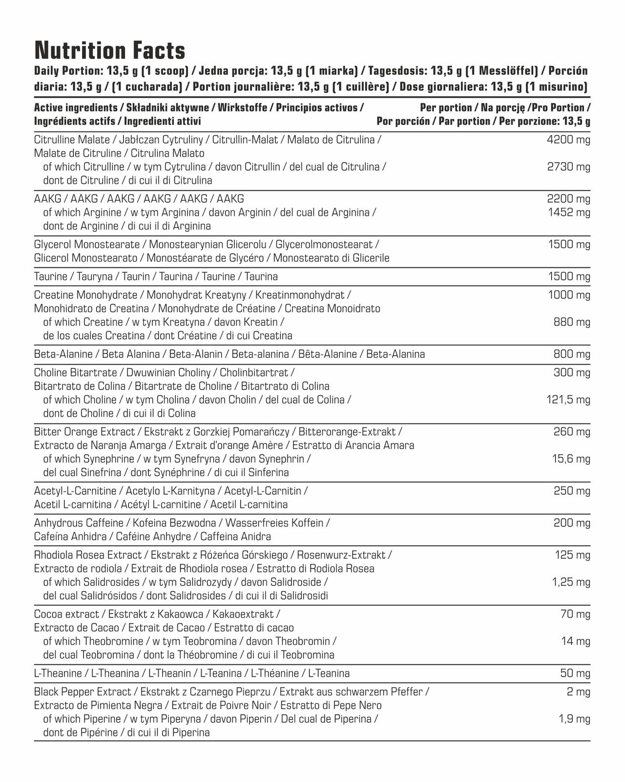 Το 7Nutrition BB PRO EXTREME είναι ένα προηγμένο προπροπονητικό συμπλήρωμα σχεδιασμένο για σωματικά δραστήρια άτομα που προσπαθούν να μεγιστοποιήσουν την προπονητική τους απόδοση. Το προϊόν περιέχει προσεκτικά επιλεγμένα δραστικά συστατικά, όπως μηλική κιτρουλίνη, AAKG, μονοστεατική γλυκερόλη, ταυρίνη, μονοϋδρική κρεατίνη, βήτα-αλανίνη, διτρυγική χολίνη, ακετυλο L-καρνιτίνη, καφεΐνη, φυτικά εκχυλίσματα και L-θεανίνη. Χάρη σε αυτό το σύμπλεγμα συστατικών, το BB PRO EXTREME υποστηρίζει τη σωματική απόδοση, τη συγκέντρωση, την αναγέννηση και τη λειτουργία του νευρικού συστήματος.