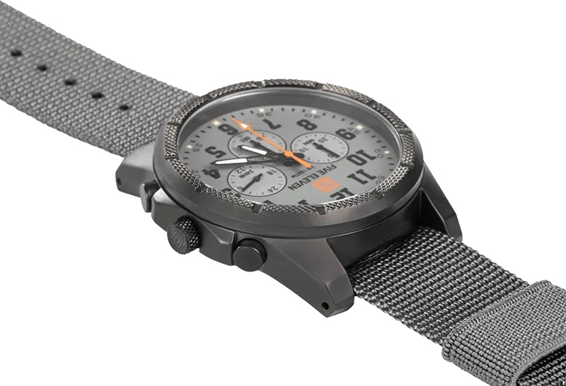 The Outpost Chrono provides precision timekeeping functionality with a tonal tactical appearance. 44mm stainless steel case (44mm) with an IP coating and mineral crystal face. The Outpost has a pull-crown for time adjustment and start/stop buttons for its stopwatch features. Hands and hour marks feature luminous material. Water resistant to 100M/330FT/10ATM. Removable 22mm webbing band.