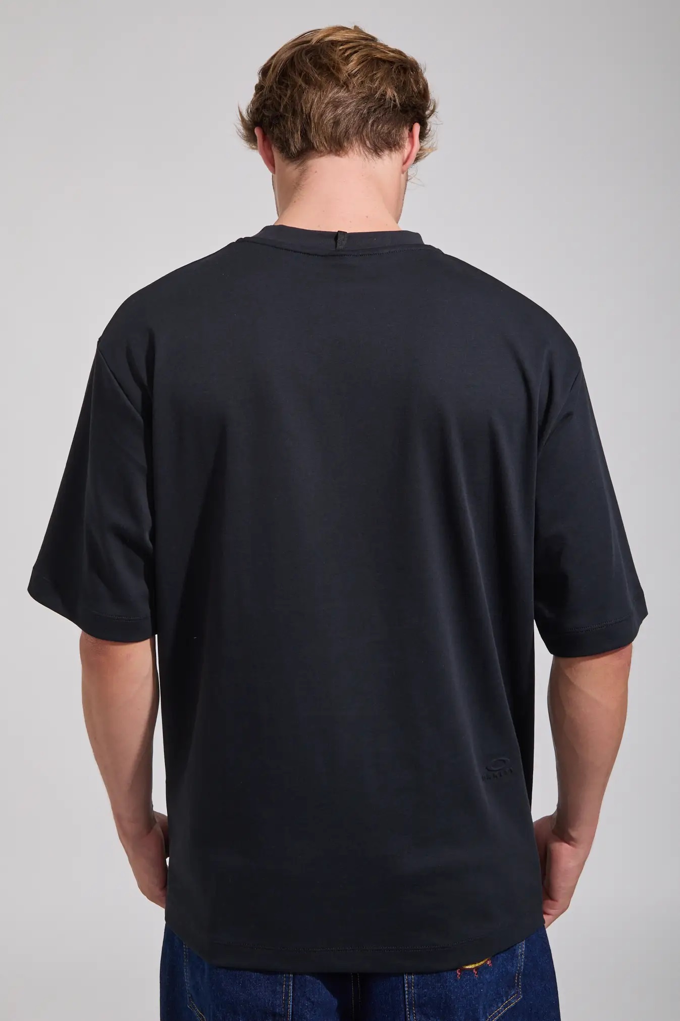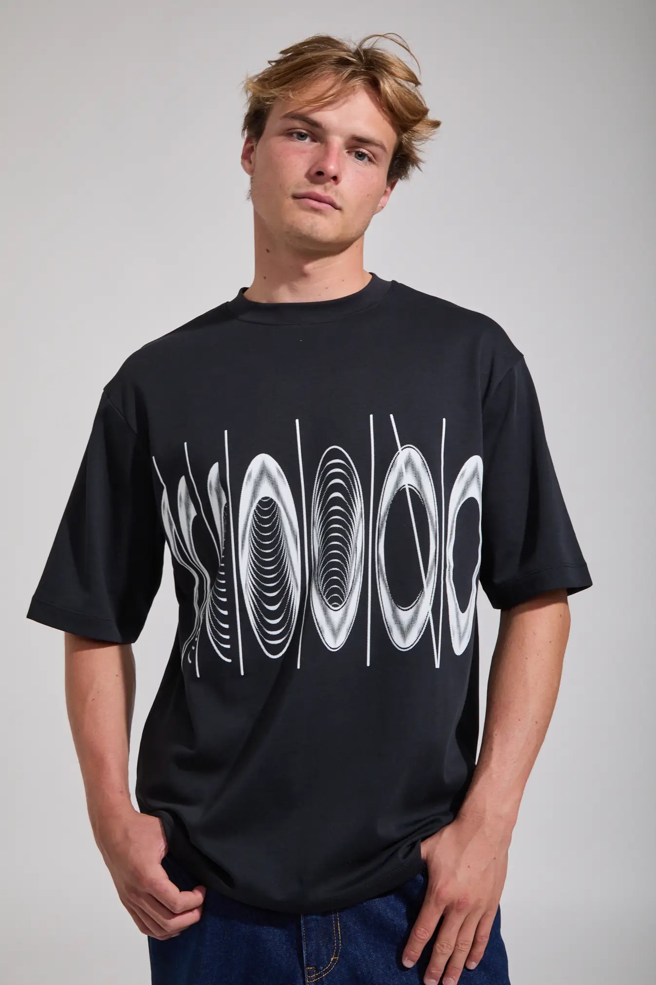 Stay cool in this cotton poly t-shirt when the temperature starts to rise. With its ribbed collar, boxy fit and breathable fabric blend, you’ll feel comfortable all day long on hot summer’s days, whether chilling with friends or on the move, while the showstopping repeated ellipse artwork on the front will further enhance your style credentials if anyone had any doubts. Embossed logo on the back, two shades available.